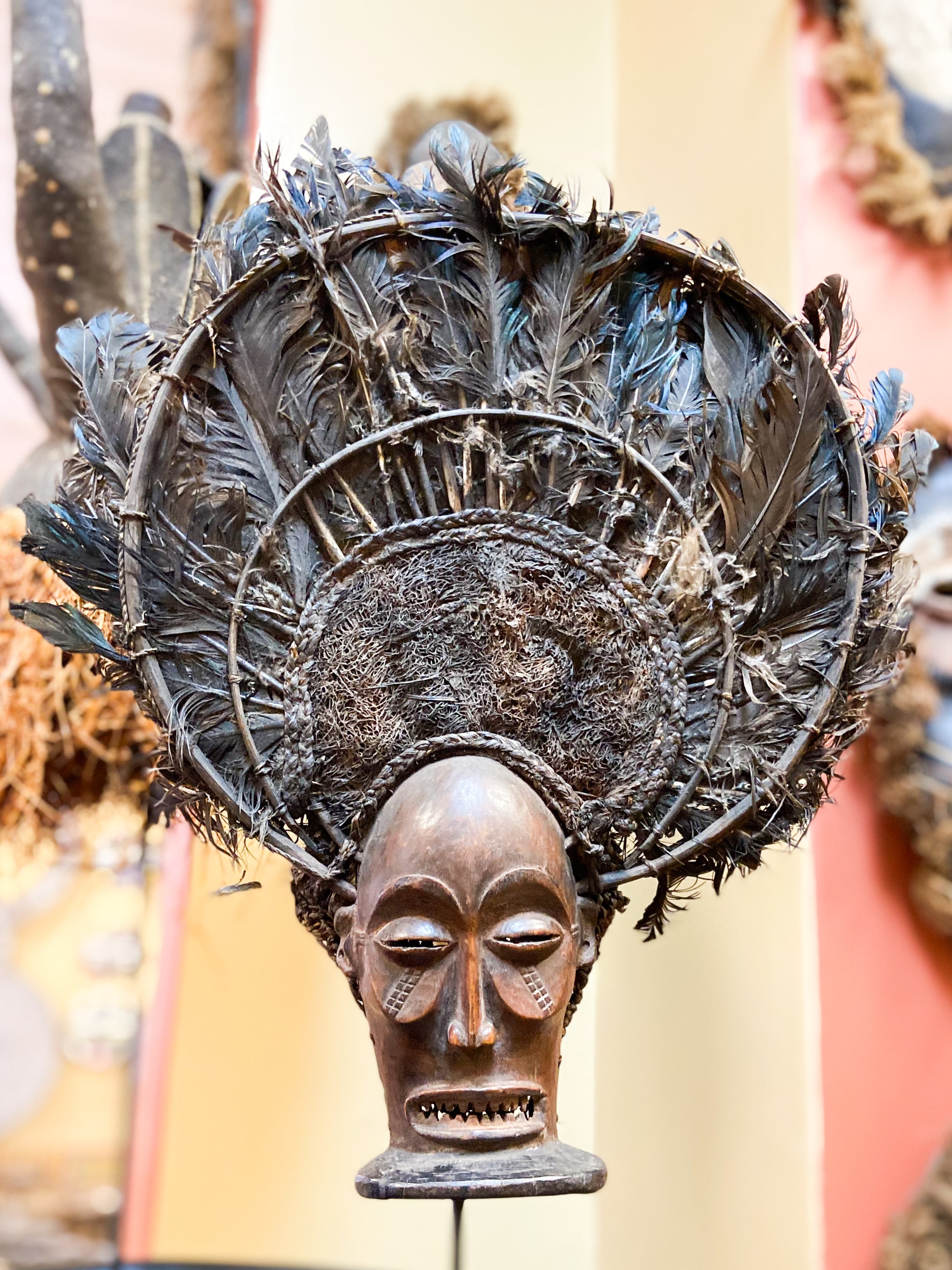 Wooden Chihongo mask depicting a chief In wooden versions, the semi-circular section is cantilevered from the chin, jutting out horizontally. Despite its rigidity, this form indicates the beard of an elder. The curving headpiece, here made from feathers, imitates the curving form of the crowns Chokwe chiefs once wore. The masks’s eyes typically are conceived of as coffee bean forms set into deep eye sockets that connote age.